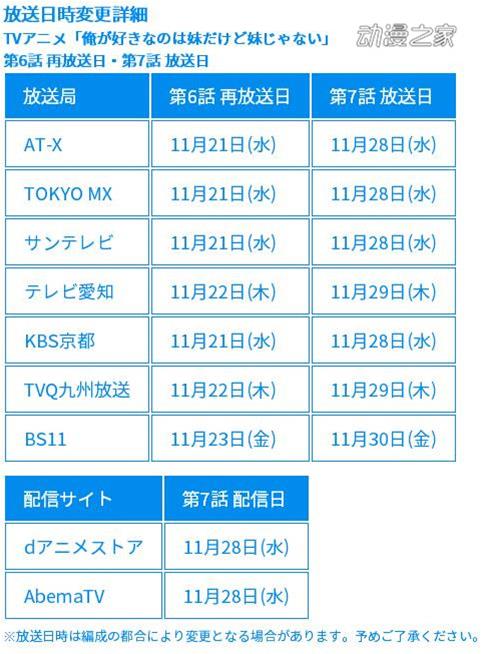 根據動畫《我喜歡的妹妹不是妹妹》官方消息,原定在11月21日播出的TV動畫《我喜歡的妹妹不是妹妹》第7集,由于制作上的問題延期放送,該檔期將重播第六話的內容。第七話的播出時間變更為下周播出,詳細的時間見下圖。官方對因放送延期為大家帶來的不便深表歉意,並希望大家在今後還能繼續支持動畫版《我喜歡的妹妹不是妹妹》。