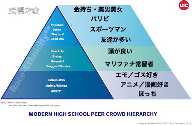 近日,美國伊利諾斯大學發表了最近的美國高中生認為的“校園等級”金字塔。這次的論文于2018年12月發布在了雜志《Journal of Adolescent Research》上。論文主要想探明怎樣的美國高中生在平時人氣和評價高。根據下圖的結果,喜歡動畫、漫畫的人和喜歡哥特、Screamo music的人以及總是自己呆著的人處于最下層。有錢人、帥哥美女、現充等位于最上層。