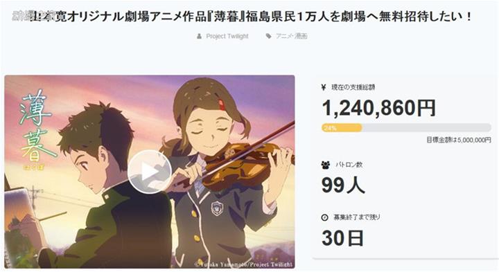 由山本寬導演制作的原創劇場版動畫《薄暮》目前開始了新一輪眾籌。根據眾籌頁面的介紹,這次眾籌的目的是希望讓在同為本作舞台的日本福島縣的1萬人免費觀看。
