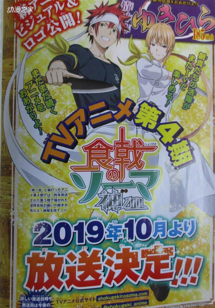 根據偷跑消息,漫畫《食戟之靈》宣布了TV動畫版第四期制作決定的消息。從圖片上可以看出,這次的第四期預計將于2019年10月開始播出,副標題為《神之皿》。