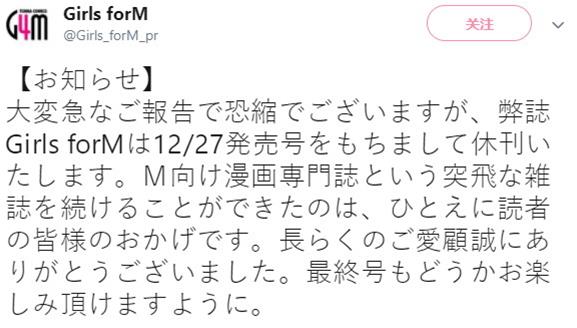 “非常抱歉突然向您報告,本雜志Girls forM將于12/27發售號後停止刊行。能夠持續制作面向M群體的這種奇特的漫畫專門雜志,完全是托各位讀者的福。感謝您的長期惠顧。希望這次的最終號您也能盡情享受。”