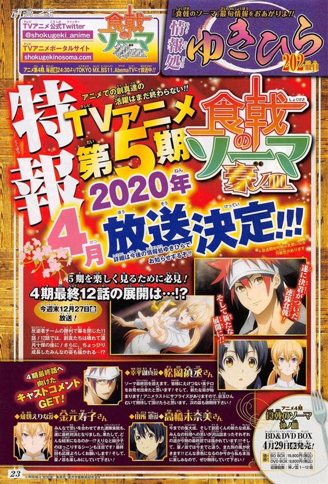 根據偷跑消息,漫畫《食戟之靈》宣布了第五季TV動畫制作決定的消息。這次的第五季副標題為“豪之皿”,預計將于2020年4月開始播出。
