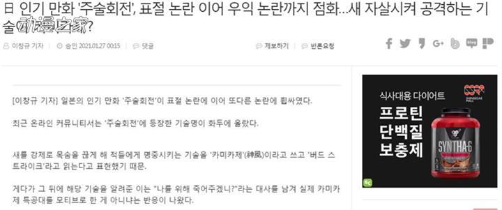 有韓國媒體報道了在漫畫《咒術回戰》中,有角色使用名為“神風”的技能,而且技能效果是讓鳥進行自殺式襲擊。這樣的設定讓很多韓國讀者感到了不滿。