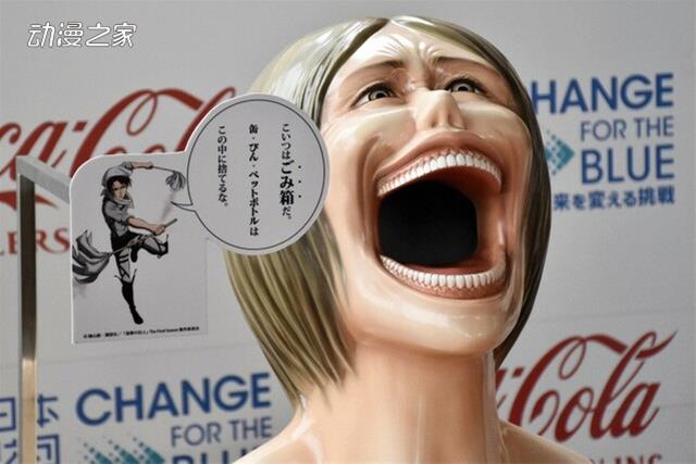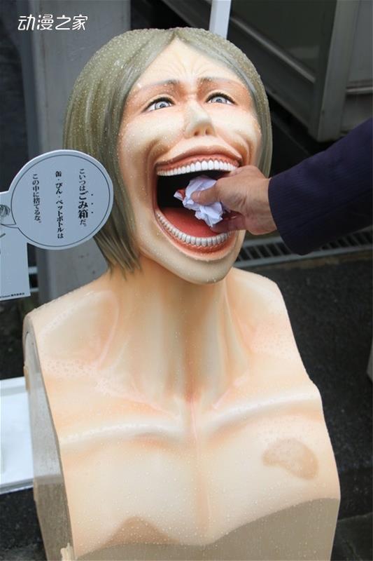 作為日本財團的“海與日本計劃”的一環,從14日起JR大分站附近設立了《進擊的巨人》中巨人形狀的垃圾箱。這次的活動主要是為了讓人們對不法遺棄垃圾問題和海洋垃圾問題產生興趣。垃圾箱預計設立到11月22日。